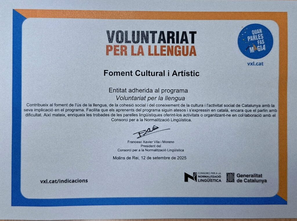 Nos enorgullece anunciar que el Foment Cultural y Artístic de Molins de Rei ya forma parte del proyecto de entidades colaboradoras del Voluntariado por la lengua. Con este paso, afianzamos nuestro compromiso con el uso y la promoción del catalán desde la cultura, desde el teatro y desde la vida cotidiana.
